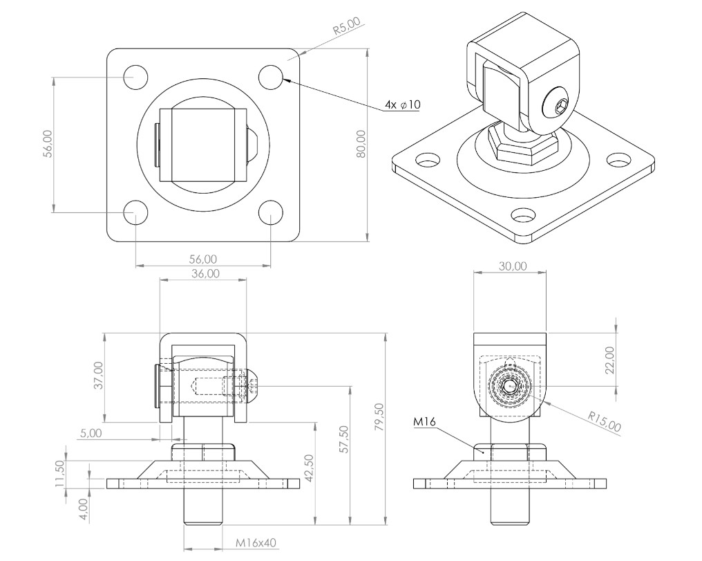 Závěs nastavitelný s plotnou 80 x 80 mm, závit M16, částečně pozinkovaný.
