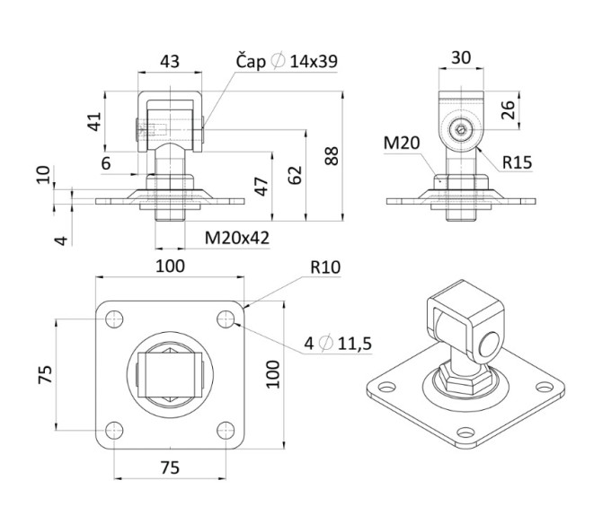 Závěs nastavitelný s plotnou 100 x 100 mm, závit M20, částečně pozinkovaný.