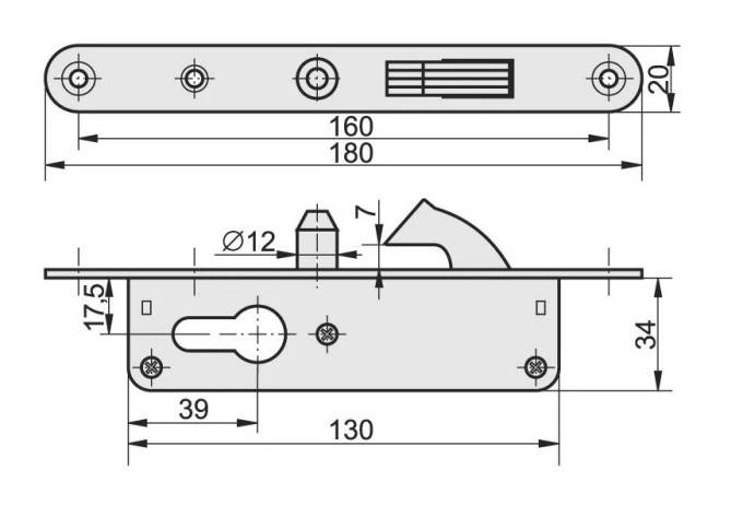Hákový zámek na posuvnou bránu 35 mm, bez otvoru na kliku. Pro posuvné samonosné brány a brány na kolečku.