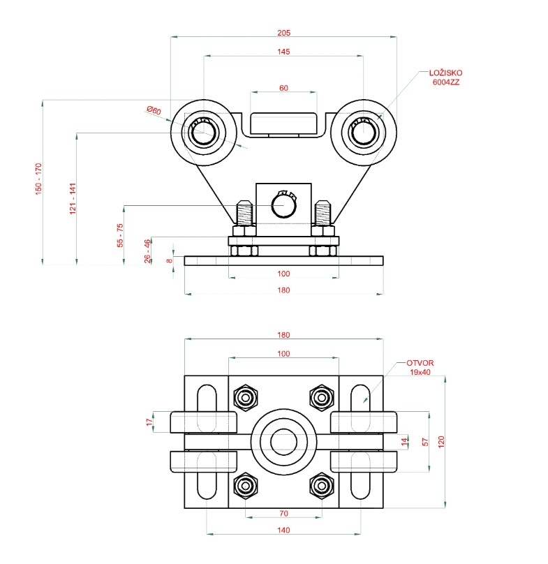 Nosný pozinkovaný ložiskový vozík pro samonosné brány do šířky průjezdu 4,5 m a pro C-profil 70x70x4.
