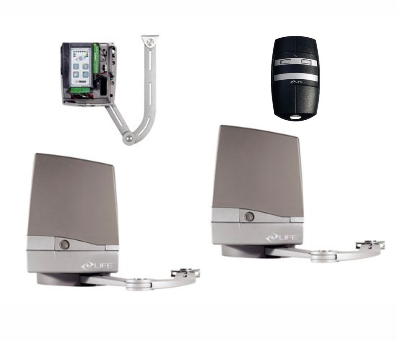 Sada pákových pohonů pro dvoukřídlé brány do délky křídla maximálně 2,3m a váhy křídla maxmálně 250kg.